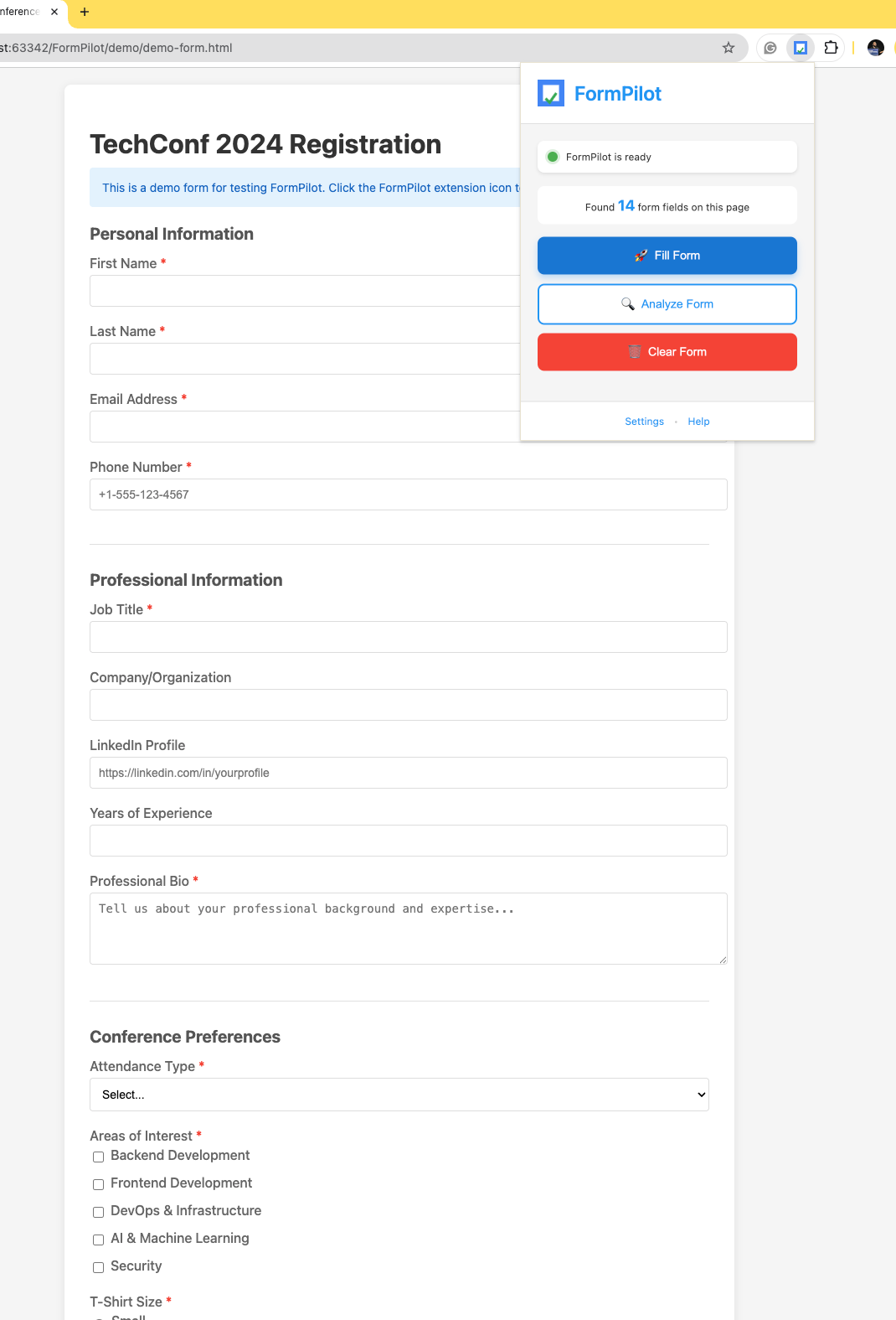 Create the demo form and open it in your browser: file:///path/to/FormPilot/demo/demo-form.html