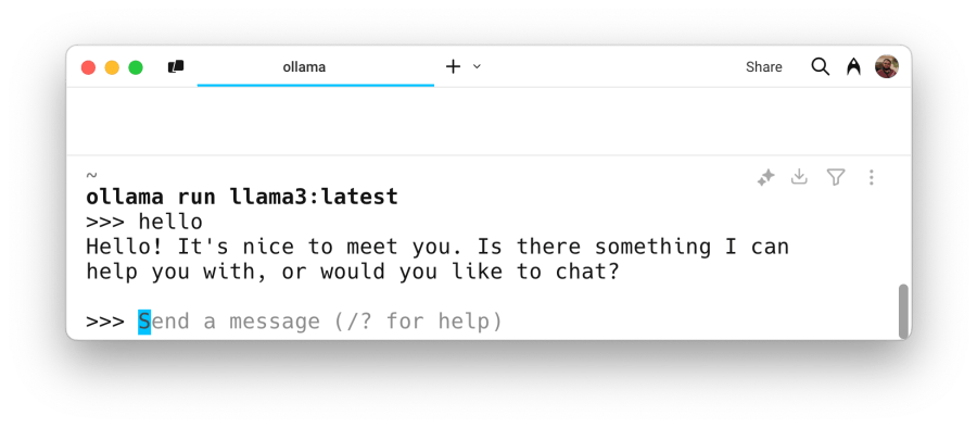 This command will first download the model files (this can take a while) and then load the model, giving you a chat prompt (>>>).