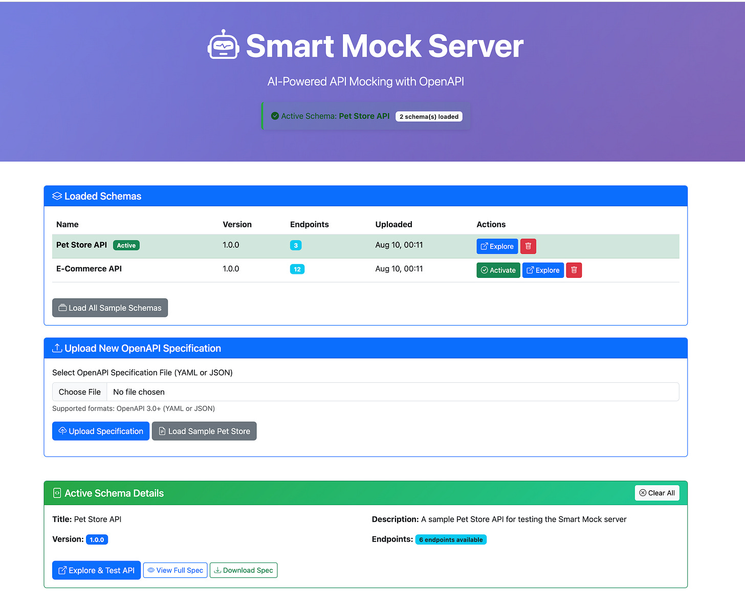 The interface allows you to switch between loaded schemas, activate one as the current mock API, and immediately test it without any extra configuration.